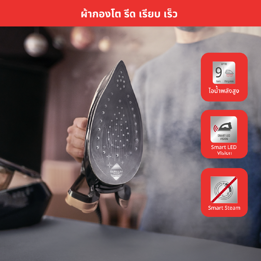 TEFAL เตารีดแรงดันไอน้ำพลังสูง รุ่น GV9820E0 กำลังไฟฟ้า 3,000 วัตต์ แทง แรงดัน 9 บาร์ ฟังก์ชั่น Smart LED Vision หน้าเตารีดเคลือบ Durilium Airglide Autoclean Ultra Thin