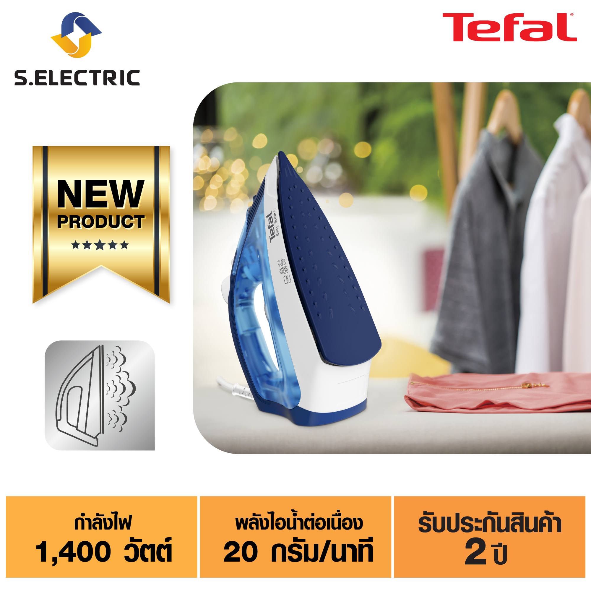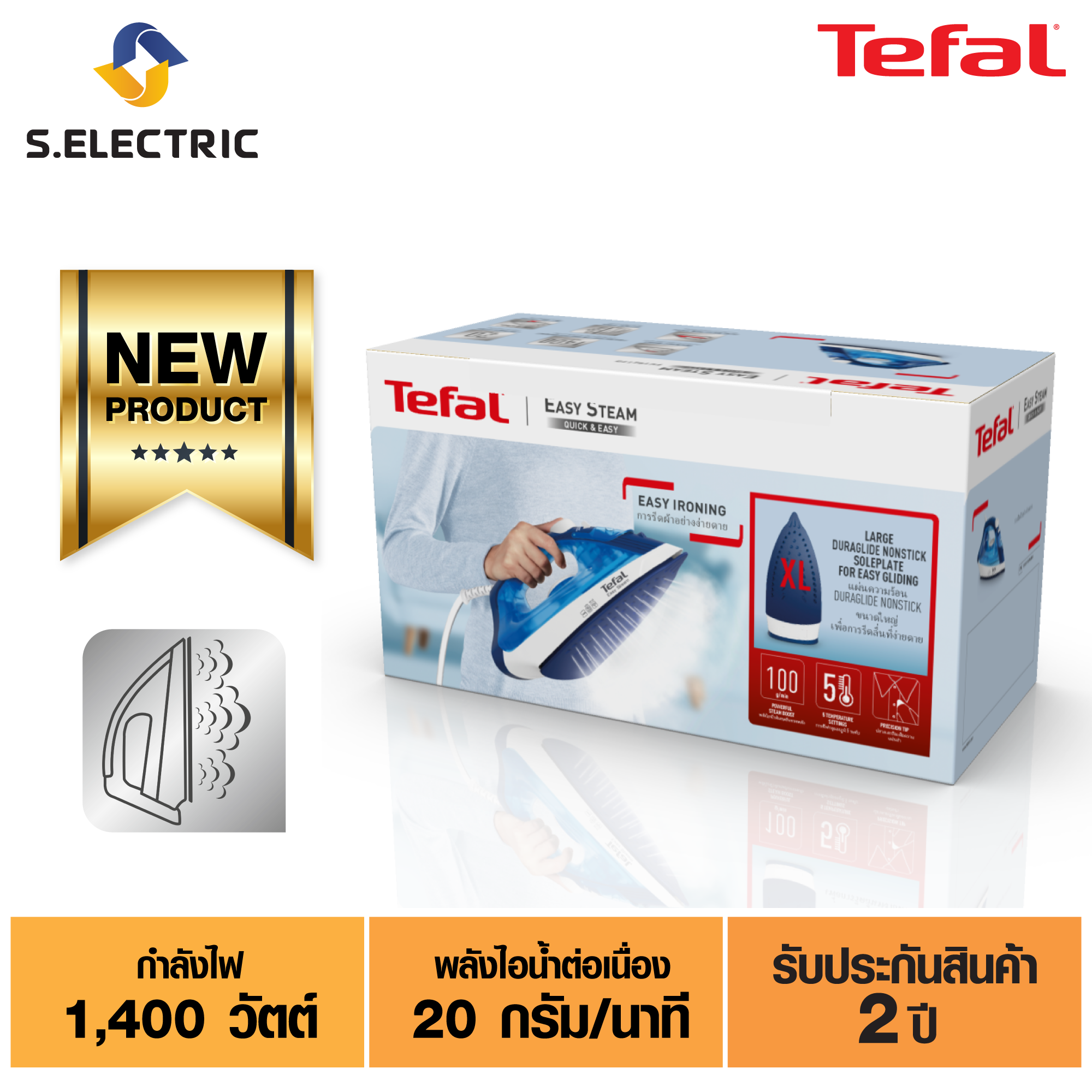 Tefal เตารีดไอน้ำ EASY STEAM รุ่น FV1941T0 กำลังไฟ 1400 วัตต์ ความจุแท้งค์น้ำ 220 มล. หน้าเตารีด colored PTFE ประกัน 2 ปี ส่งฟรี